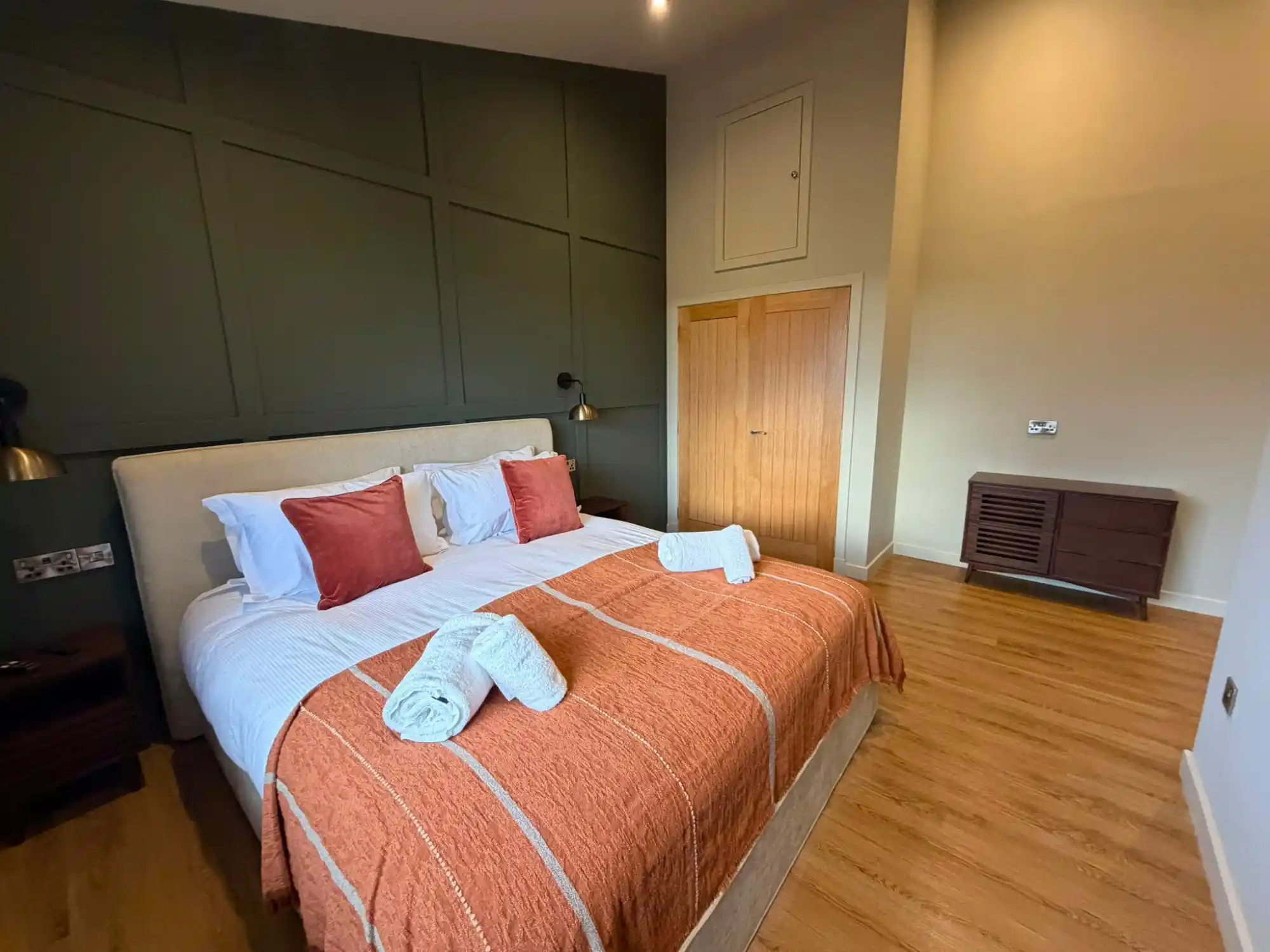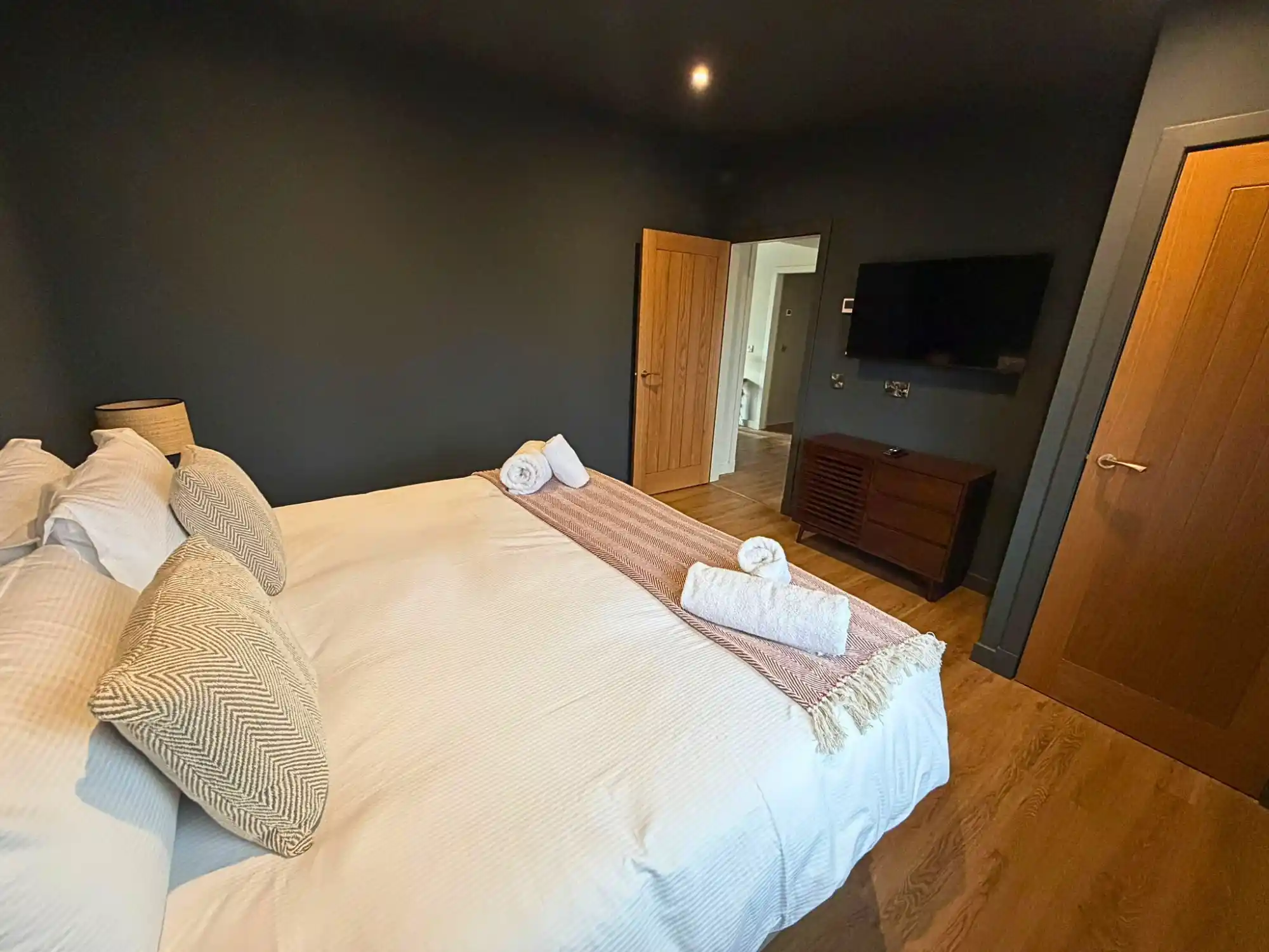 Inside, you’ll find a bright open-plan living area with a log burner — perfect for relaxing after a day of walking or sightseeing. The kitchen features high-quality finishes and all the modern equipment you need for an easy stay. Both bedrooms offer comfortable beds and plenty of storage, with the main bedroom including its own ensuite.